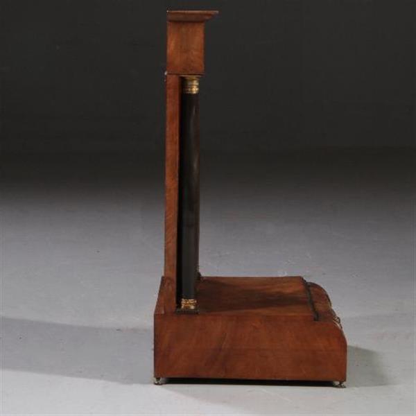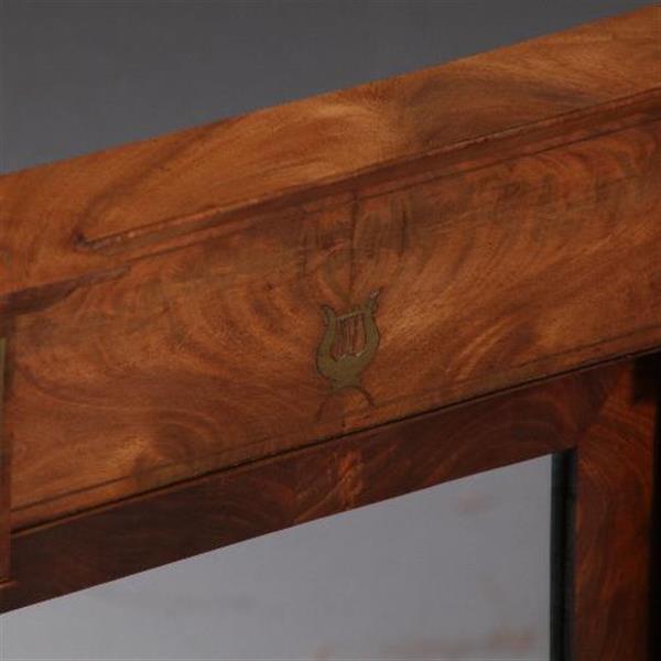 Mahonie met bloemmahonie Empire tafelspiegel met in de gebolde voet 3 laden, de kleine laden met leeuwenmaskertjes de grote met een bronzen knopje. Het kantelbare spiegeltje hangt tussen twee stijlen met ebbenhout gefineerde zwarte zuilen met bronzen basementjes en kapiteeltjes, in de kap een ingelegde liertje.