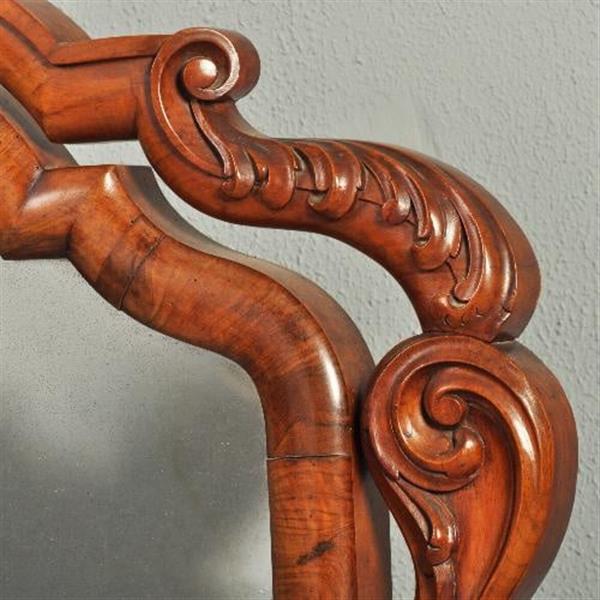 Kantelbare mahoniehouten Victoriaanse kapspiegel. Het rijke steekwerk is levendig gestoken en fraai van verhoudingen. Het onderplankje is gebogen uitgevoerd en daardoor rollen de sierraden of haarspelden er niet af.