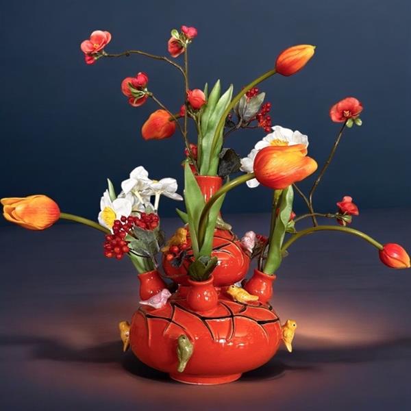 Geef je interieur een stijlvolle en speelse twist met deze unieke birdvase tulpenvaas van keramiek, voorzien van een kleurrijk vogeltjes decor . Deze rood/oranje tulpenvaas is compleet opgemaakt met luxe kunstbloemen zoals tulpen, narcissen en bessen, en is een echte blikvanger in elke ruimte.