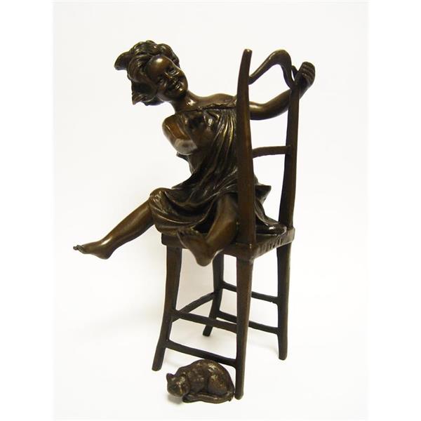 Een geweldig mooi beeld van een blij kind die op een stoel zit, met een kat als detail, gemaakt van brons.