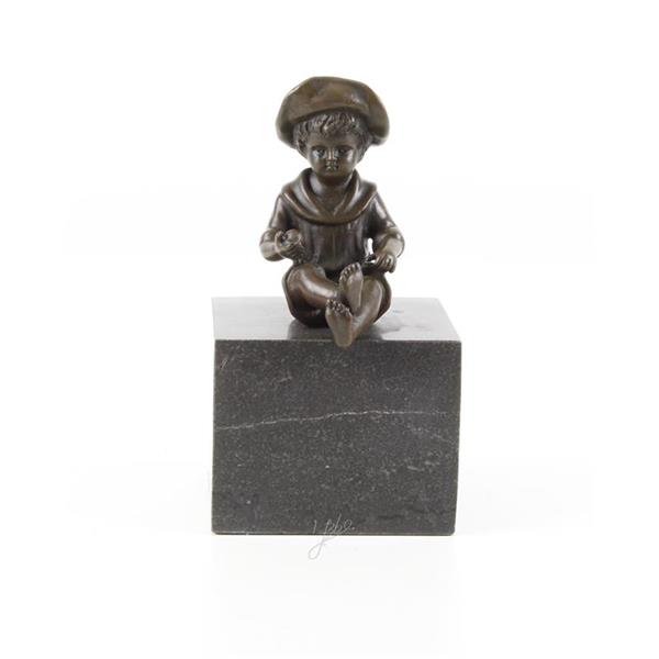 Een bronzen beeld/sculptuur van een klein, zittend jongentje.