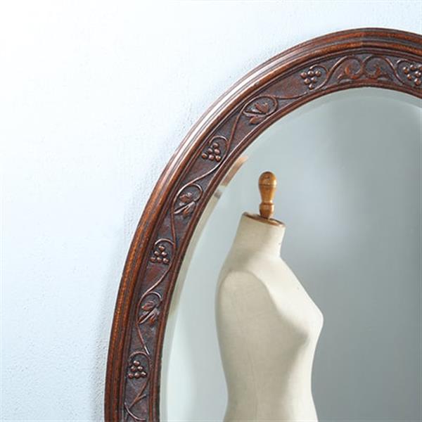 Ovale eikenhouten schouwspiegel met geprofileerde en verdiepte lijst en het spiegelglas met een fraai geslepen facetrand. In de bijna mahoniekleurige eikenhouten lijst is een verdiepte band waarin een slingerende druivenrank is gebeeldhouwd. Fijne slingerende blaadjes en takjes met telkens een klein trosje druiven.