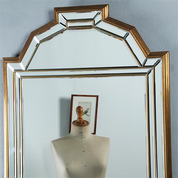 De kroon met een fraaie bokaal waar op zeer weelderige wijze de guirlandes vanaf slingeren naar strikjes waar de spiegel aan lijkt te hangen.