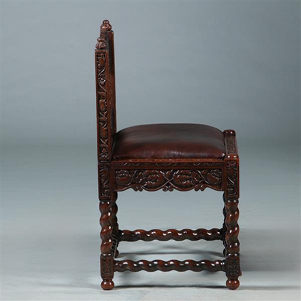 Een Nederlandse koloniale stoel, Indonesië periode 1680 – 1720 met steekwerk van geslingerde florale motieven, spiraalvormig gedraaide poten en regels en bijpassende dunnere spijlen in de rugleuning. Het geheel op kleine bolpootjes. De invalzitting met leer bekleed, deze was oorspronkelijk bespannen met webbing.