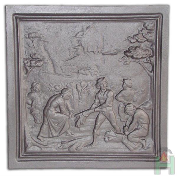 Zware uitvoering in massief gietijzer met fraai oogst tafareel als afbeelding op het front, op moment deze plaat als vuurscherm wordt gebruikt achter
