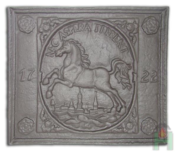 Open haard plaat, wandornament, paard1722, massief zwaar gietijzer.