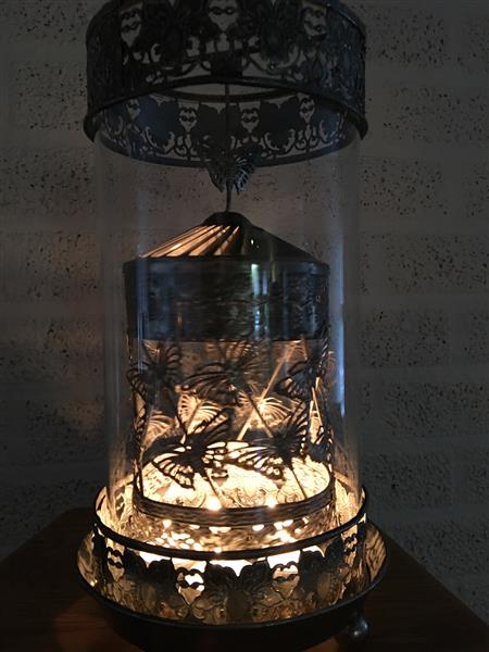Deze lantaarn is stevig en solide en dus mooi aanwezig. Door de opstijgende warmte gaat de vuurkap ronddraaien en verschijnen de vlinders in silhouet groot op de muur !