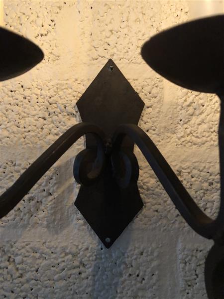Deze mooie smeedijzeren wandkandelaar geeft een geweldige atmosfeer af, kaarsen plaatsen en aansteken, geweldig fraai !!