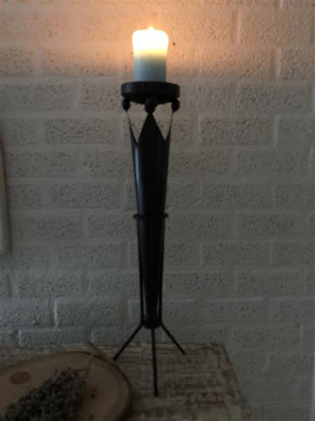 Mooie staande kaarsenhouder in de vorm van een fakkel, het heeft een kasteelachtige impressie, zeer fraai.
