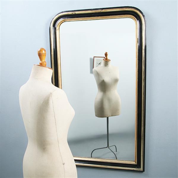 Rechthoekige Franse antieke Louise Philippe schouwspiegel met ronde hoeken aan de bovenzijde. Deze imposante spiegel heeft een prachtige diep geprofileerde lijst waarvan het grootste gedeelte zwart gepolitoerd is met een brede gouden baan en een dubbele goud profiel tegen de binnenzijde van de lijst.