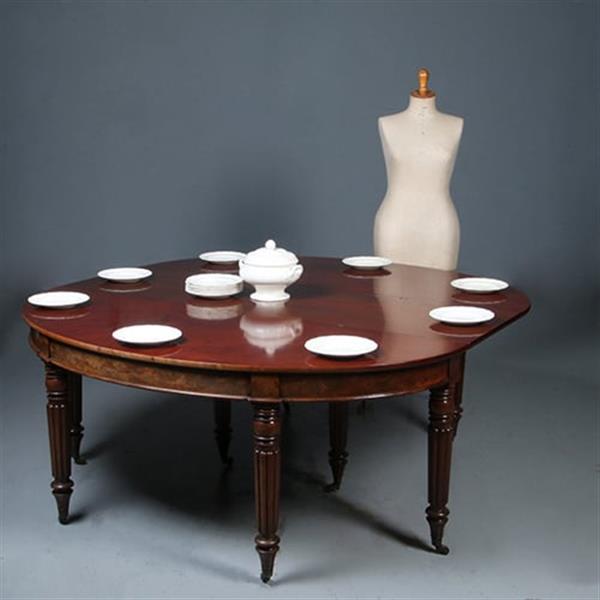 Zeer zeldzame Engelse Victoriaanse grote antieke halve-maan eetkamertafel ( Large Antique Demi Lune Dining Table ). Te gebruiken als wandtafel of als eetkamertafel, in de huidige samenstelling tot 8 personen. De tafel staat op gedraaide en gecanneleerde poten op kleine oorspronkelijke wielen.