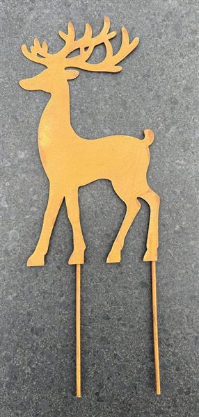 Een metalen tuinsteker hert met gewei van roestig metaal.