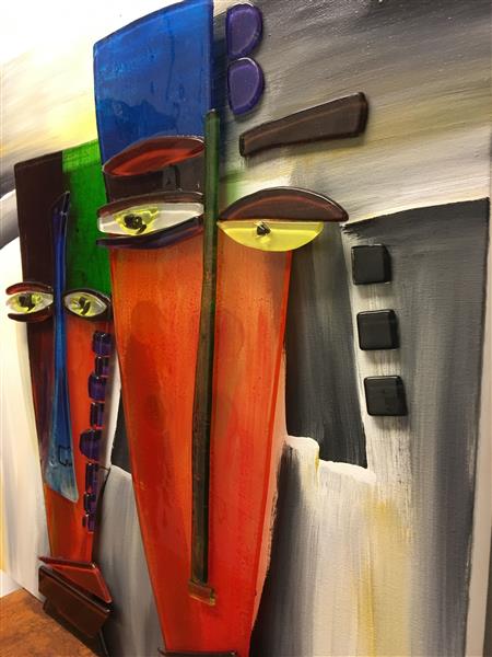 Wandecoratie glas op doek, "faces", zeer apart en fraai!!